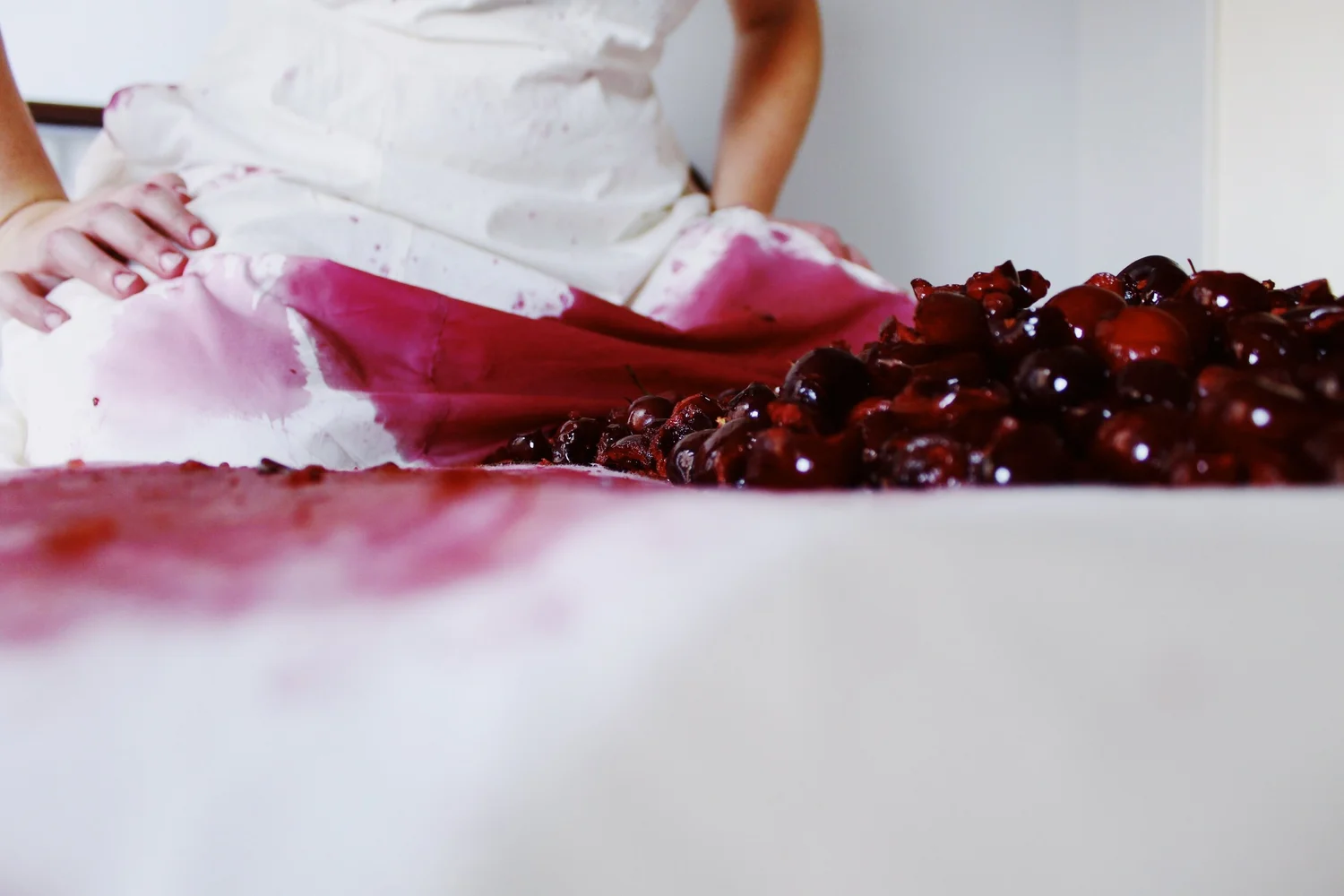 The artifacts remaining from this performance, the stain sheets, the conserved cherry stones, the ruined gown, are both individual and collective testimony.